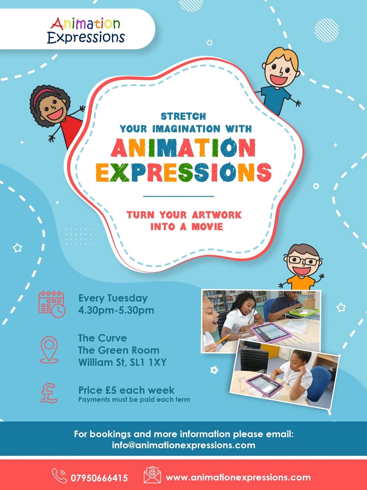 Animation workshops for age 5-11 at the Curve, Slough every Tuesday 4.30pm-5.30pm. Starting September 10th 2024